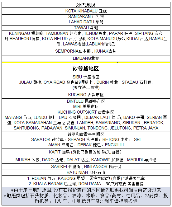 1、时效说明: 正常7个工作日左右,时效不包含发货当天、节假日、航班延误、清关延误、海关查货、当地派送公司的派送时效等,派送地址如属偏远地区,在正常转运时效上增加 2-4 个工作日。国际运输环节众多,对时效无法控制,每个环节如果出现问题都会影响时效,我们只能保证我们仓库及时交货给运输公司,运输环节我们无法控制,只有尽可能的查询催促,对时效不做保证,请谅解。对时效要求高的重要货品,请慎寄。星期天至星期五发货,星期六不发货。 2、计费方法:重量不足1KG按1KG算;运费会因航空公司或快递公司变动而变动,特别是每年的双11,双12等重大优惠购物节日。 3、敏感货:带电充电有马达等的电子产品,磁性物品,移动电源,电池,化妆品,保健品,食品,音箱,风扇,宗教用品相关等为常见敏感货。如不清楚请咨询客服。 4、禁运物品:易燃易爆物品(汽油,打火机,有压缩气体的物品比如礼炮),化学原料,油漆涂料,烟、酒、鲜活物品、动植物、腐蚀品,国际航空运输协会(IATA)限制和其它违法物品国家法令禁止流通或寄运的物品如如文物、管制类刀具、古董、各种武器、仿真武器(仿真玩具枪,枪形物品等)、弹药、国家货币(现金等)如不清楚可先咨询客服。 5、超长超重物品:超过150CM需加收150元,大于200CM需要走敏感渠道,并加收200元;ABX单件重量不能超25KG。 6、丢失赔偿: 1.不买保险(按三倍运费或货物价值两者取其低赔偿,最高不超过600元人民币) 2.购买普货5元保险(1000元以内货物价钱+运费全赔) 3.购买普货10元保险(2000元以内货物价钱+运费全赔) 4.购买敏感货10元保险(1000元以内货物价钱+运费全赔) 保险仅限整个包裹丢失在淘宝,天猫、京东等大型网站的货物,能提供详细订单信息和物流信息证明才能索赔。未能提供的一律按不买保险的赔偿。 贵重物品(单价超过800元,货物总值超2000元)慎邮寄,丢失也只能按三倍运费赔偿最高不超过600元人民币,不提供保险服务。 7、损坏不赔偿:国际空运中,货物要经过多次的搬运和装卸,对于货物的破损无法控制,所以,易碎品慎寄,我司建议客人叫卖家做好防损包装,我司对任何托运的货物,包括由我司代由包装的货物,快递公司是不承担任何损坏赔偿,包括任何形式上的刮花,破损,质变,形变,我们也不能提供任何赔偿,请谅解。 8、仓储费:从包裹签收日期起,30天内免费,超过30天按1元/KG/包裹/天,签收超过3个月的仓库有权处理,不再承担保管责任。(体积超过50KG的,从签收日起只免费3天,超过3天按1元/KG/天计算) 9、以上报价不包括目的地的关税、偏远地区附加费、仓储费、更改地址费、 罚款以及其它杂费。如果收件人拒付将转为寄件人承担。 |